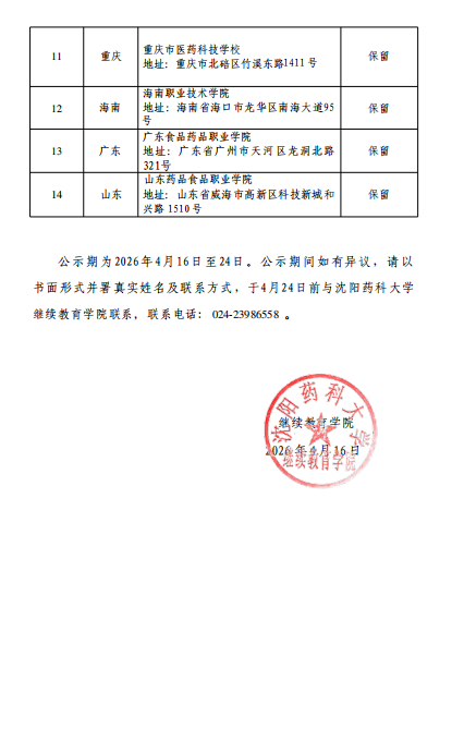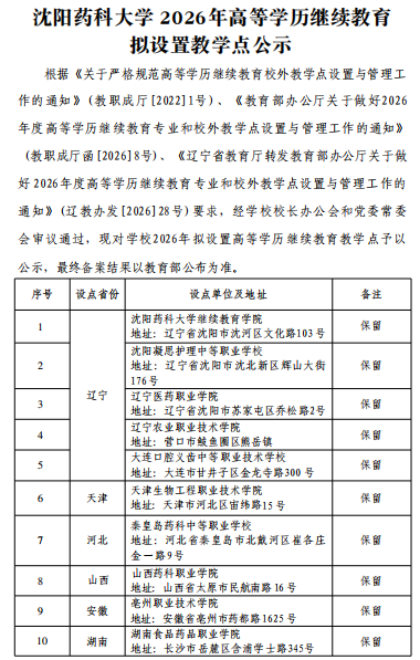 沈阳药科大学2026年高等学历继续教育拟设置教学点公示
